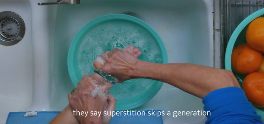 Capturing an intimate look of a cultural tradition, the viewer watches like a fly on a wall as Nguyen is seen struggling to put on a jade bracelet by herself. Her mother’s hands appear and apply soap to the artist’s hands, allowing them to successfully squeeze through the bracelet. The video is meant to be humorous and lighthearted, letting the viewer in on the artist’s embrace of her cultural identity and feel the warmth which comes from home.