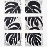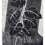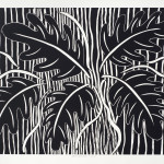 These works utilize the philodendron as a subject matter. The philodendron is the most showy tropical leaf! I am always amazed seeing plants that are houseplants at home growing in the ground in tropical climates. I love the linear feel to the leaf shape, the edges of the leaves are a wonderful balance of positive and negative shapes. There is also a slightly sinister side to a leaf that can be as big as a person that I try to convey with some these works. The two dimensional images are a mix of monotypes, linocuts, and collagraphs, made by gluing paper cutouts to cardboard and inking the resulting printing plate.