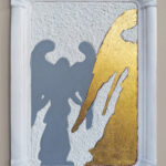 Acrylic paint, coarse structural paste and gold leaf on a paper plate, 6.5” x 9.5”, 2023